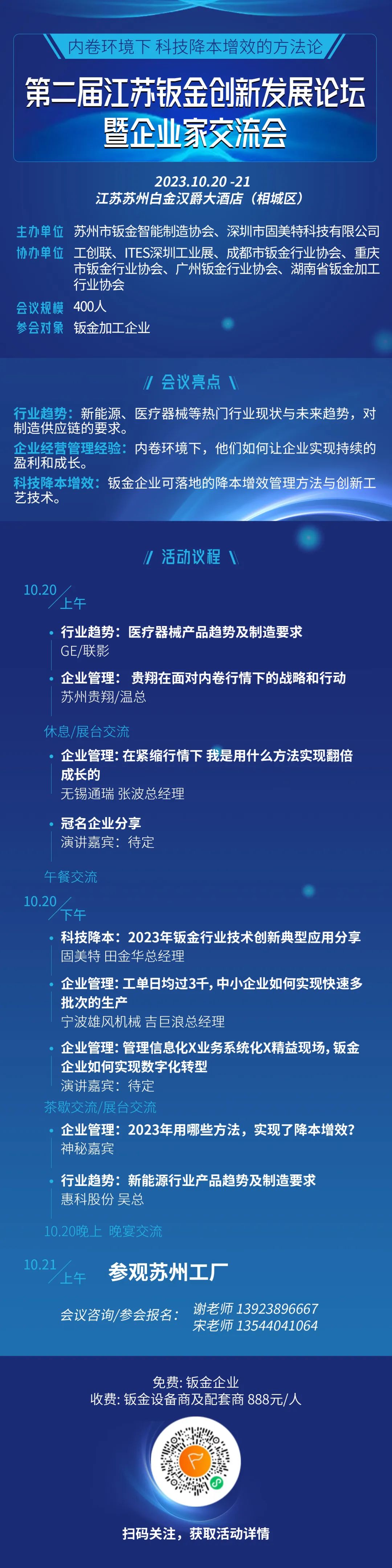 別急,就在10月20日,在蘇州,《第二屆江蘇鈑金行業(yè)論壇》,我就帶你們認識8家企業(yè),聽他們是如何穿越周期,降本增效,逆勢增長的。